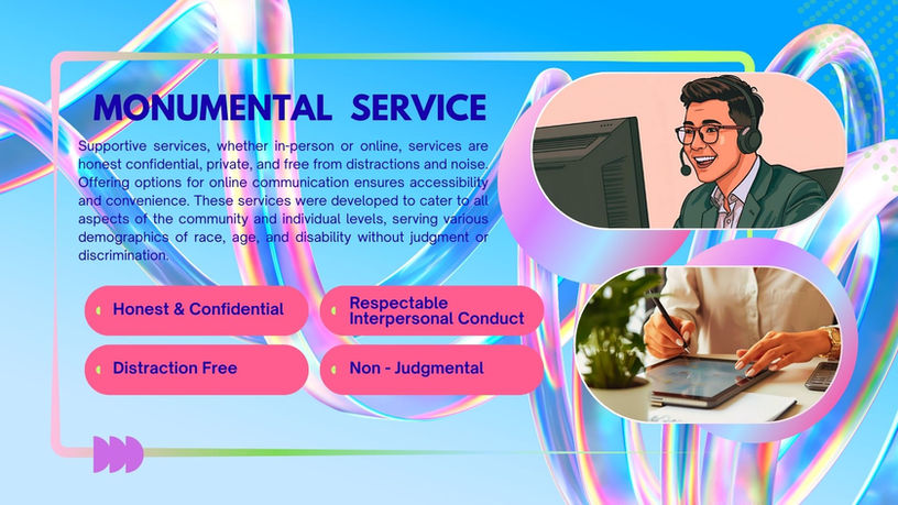 Supportive services, whether in-person or online, services are honest confidential, private, and free from distractions and noise. Offering options for online communication ensures accessibility and convenience. These services were developed to cater to all aspects of the community and individual levels, serving various demographics of race, age, and disability without judgment or discrimination.